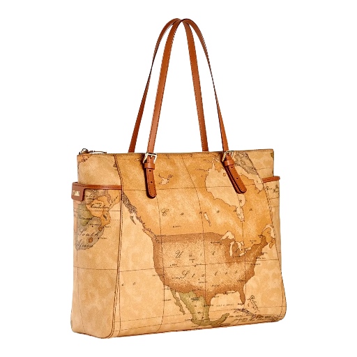 Borsa shopping in tessuto stampato con cartina geografica Geo Classic con manici in pelle color cuoio impreziositi da fibbiette in metallo dorato, tasche laterali, chiusura con zip. Perfetta da portare tutti i giorni per completare i tuoi look ufficio.